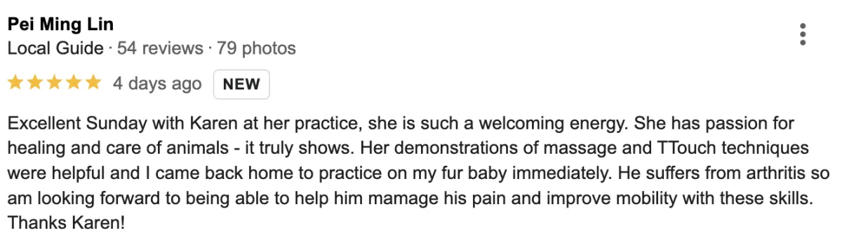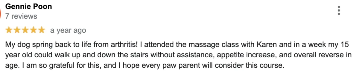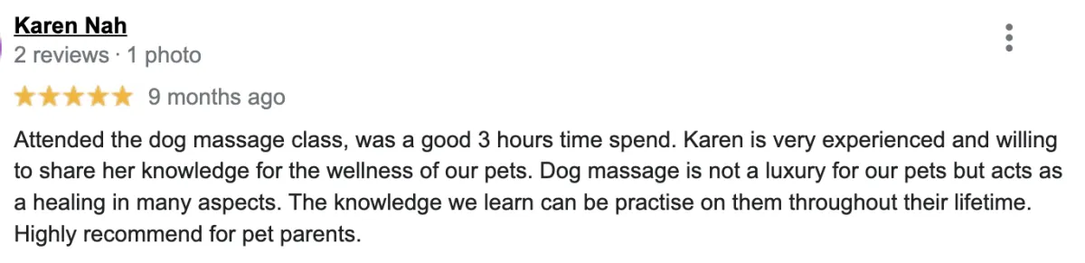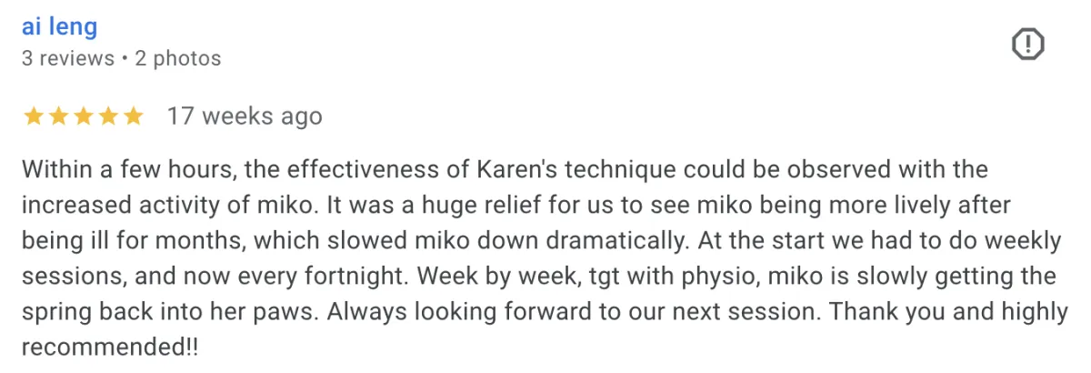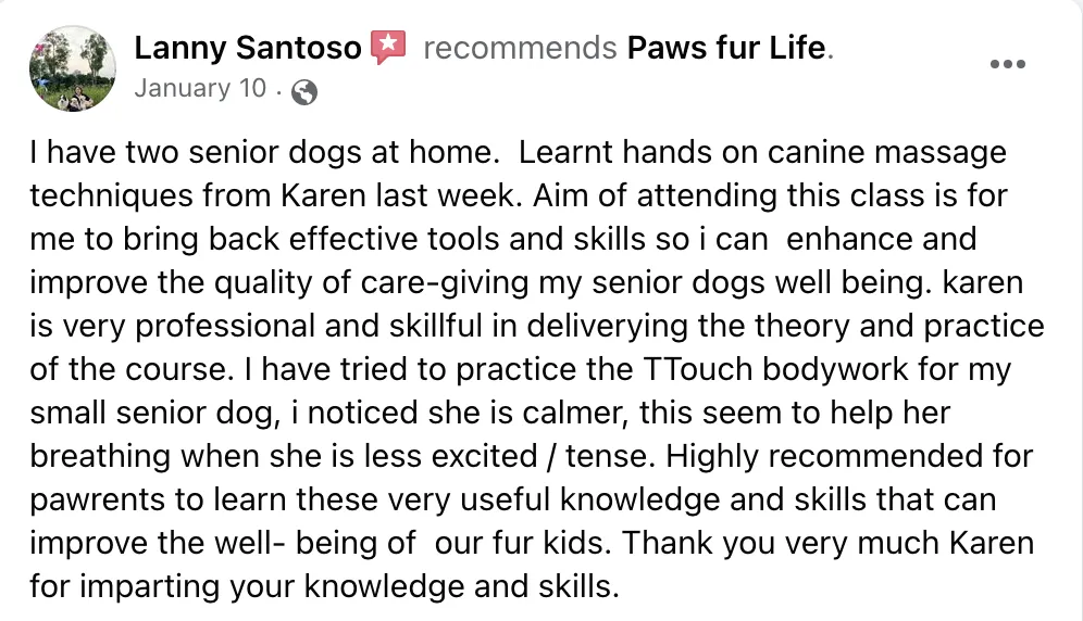 I attended Karen’s seminar where she shared 3 basic strokes which I immediately applied to my 2 furkids. I followed Karen’s method of massage and it works..!
